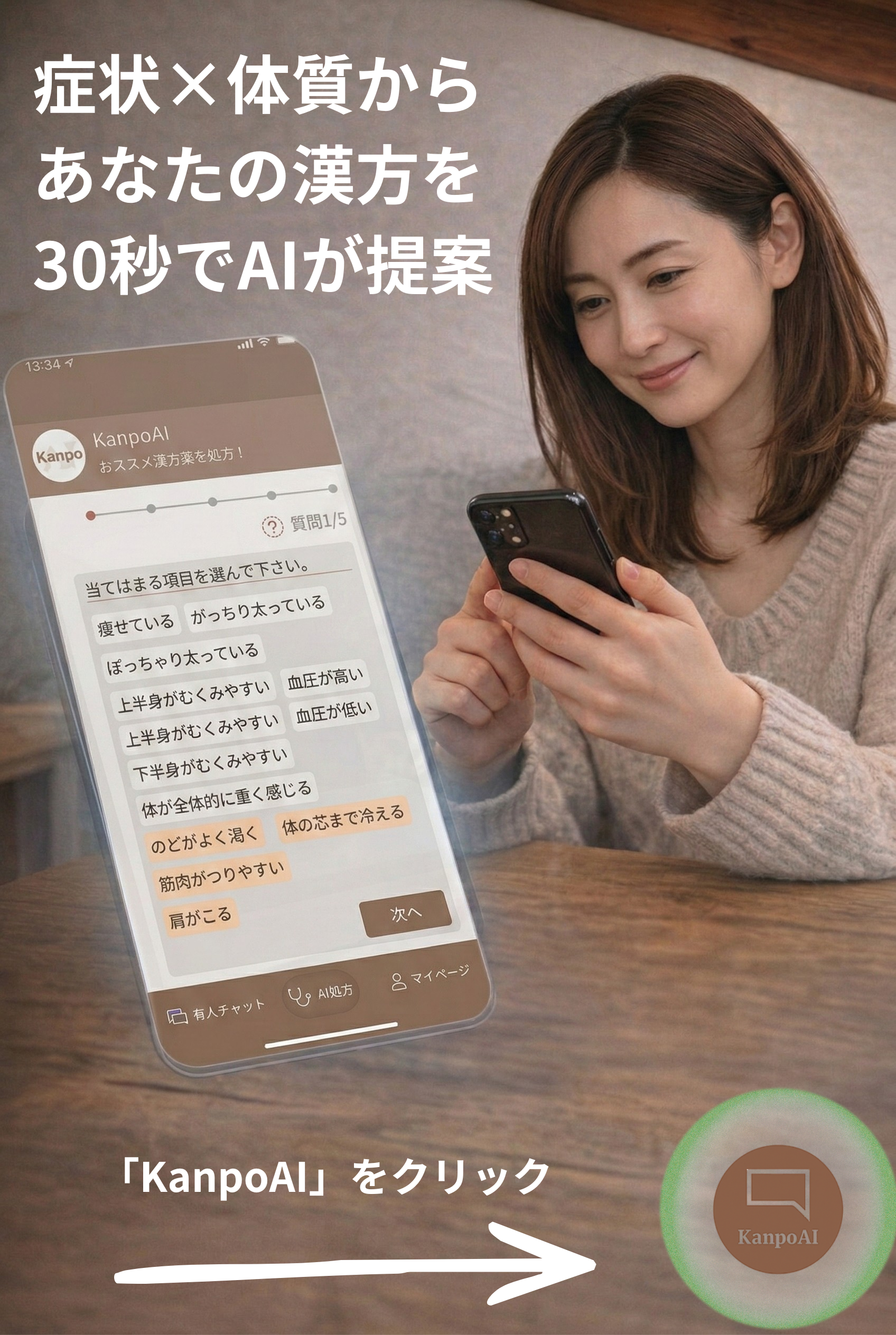 ChatGPTやGeminiなどの生成AIと異なり、あなたの「お悩み(3つの症状の程度・患った期間)」に加え、漢方の「8つの体質」を加味して選定いたします。ぜひお試しください。【無料】