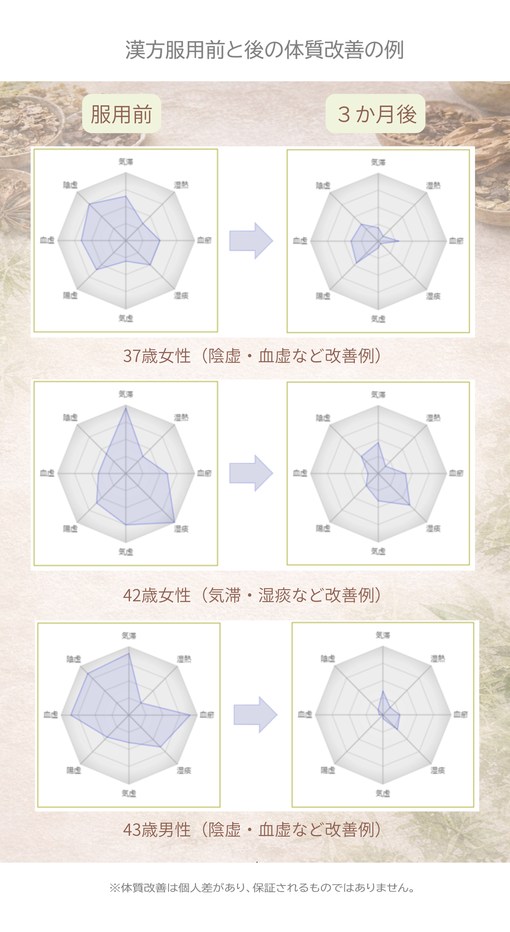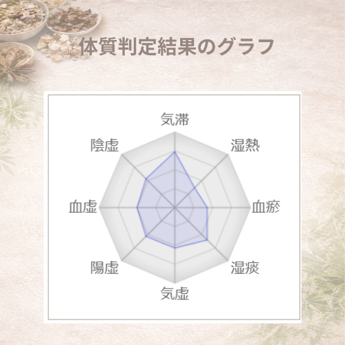 東洋医学の理論に基づき、「気・血・水・精」のバランスからあなたの体質を判定します。